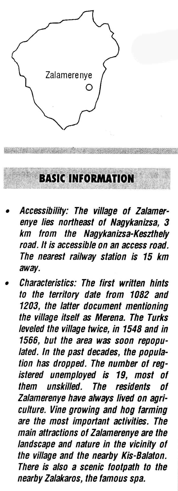 Nyilvános 2233 | 6070 | Zalamerenye | BASIC INFORMATION Accessibility: The village of Zalamerenye lies northeast of Nagykanizsa, 3 km from the Nagykanizsa-Keszthely road. It is accessible on an access road. The nearest railway station is 15 km away. Characteristics: The first written hints to the territory date from 1082 and 1203, the latter document mentioning the village itself as Merena. The Turks leveled the village twice, in 1548 and in 1566, but the area was soon repopu-lated. In the past decades, the population has dropped. The number of registered unemployed is 19, most of them unskilled. The residents of Zalamerenye have always lived on agriculture. Vine growing and hog farming are the most important activities. The main attractions of Zalamerenye are the landscape and nature in the vicinity of the village and the nearby Kis-Balaton. There is also a scenic footpath to the nearby Zalakaros, the famous spa. This text came from the following book: Title: Handbook of Zala county (Zala megye kézikönyve) Series: County handbooks of Hungary (Magyarország megyei kézikönyvei) Chief editor: Hóbor József Publisher: (Hatvan), CEBA-Hungary Ltd, 1998 ETO: 908.439.121(035) ; 050.8(439.121) ISBN: 963-9089-18-2 Pages: 488-1040 p. Remark: Closed on: 1998. márc. 31. |
