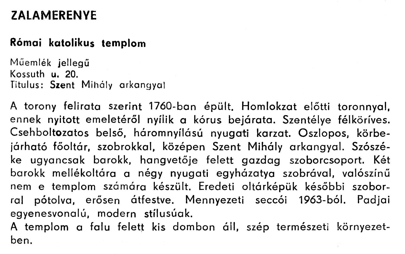 Nyilvános 1734 | 4478 | Zalamerenye - Zala megye műemlékei 1979 119old | A részlet szövege: ZALAMERENYE Római katolikus templom Műemlék jellegű Kossuth u. 20. Titulus: Szent Mihály arkangyal A torony felirata szerint 1760-ban épült. Homlokzat előtti toronnyal, ennek nyitott emeletéről nyílik a kórus bejárata. Szentélye félköríves. Csehboltozatos belső, háromnyílású nyugati karzat. Oszlopos, körbejárható főoltár, szobrokkal, középen Szent Mihály arkangyal. Szószéke ugyancsak barokk, hangvetője felett gazdag szoborcsoport. Két barokk mellékoltára a négy nyugati egyházatya szobrával, valószínű nem e templom számára készült. Eredeti oltárképük későbbi szoborral pótolva, erősen átfestve. Mennyezeti seccói 1963-ból. Padjai egyenesvonalú, modern stílusúak. A templom a falu felett kis dombon áll, szép természeti környezetben. A részlet a következő könyvből származik: Cím: Zala megye műemlékei Szerző: Németh József (1928) Közreműködő: Vándor László (szerk.) ; Szabóky Zsolt (1941) (fotó) Szerz. közl.: Németh József ; [szerk. Vándor László] ; [fotók... Szabóky Zsolt] Kiadás jelzés: 2. bőv. kiad. Kiadás: Zalaegerszeg : Zalai Ny., 1979 ETO jelzet: 72(439.121) ; 7.025.3/.4(439.121) ; 908.439.121 Tárgyszó: Zala Szakjelzet: 908 Cutter: N 53 Nyelv: magyar Oldalszám: 134 p. |