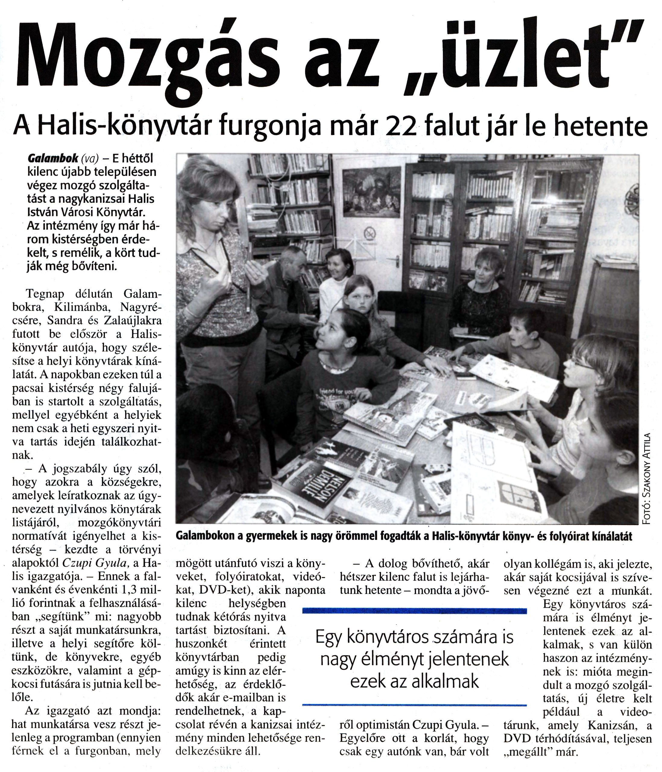 Nyilvános 7443 | 15038 | Zalai Hírlap 2008. március 14. 4. oldal - Mozgás az üzlet | Mozgás az „üzlet" A Halis-könyvtár furgonja már 22 falut jár le hetente Galambok (va) - E héttől kilenc újabb településen végez mozgó szolgáltatást a nagykanizsai Halis István Városi Könyvtár. Az intézmény így már három kistérségben érdekelt, s remélik, a kört tudják még bővíteni. Tegnap délután Galambokra, Kilimánba, Nagyrécsére, Sandra és Zalaújlakra futott be először a Halis-könyvtár autója, hogy szélesítse a helyi könyvtárak kínálatát. A napokban ezeken túl a pacsai kistérség négy falujában is startolt a szolgáltatás, mellyel egyébként a helyiek nem csak a heti egyszeri nyitva tartás idején találkozhatnak. - A jogszabály úgy szól, hogy azokra a községekre, amelyek leiratkoznak az úgynevezett nyilvános könytárak listájáról, mozgókönyvtári normatívát igényelhet a kistérség — kezdte a törvényi alapoktól Czupi Gyula, a Halis igazgatója. - Ennek a falvanként és évenkénti 1,3 millió forintnak a felhasználásában „segítünk" mi: nagyobb részt a saját munkatársunkra, illetve a helyi segítőre költünk, de könyvekre, egyéb eszközökre, valamint a gépkocsi futására is jutnia kell belőle. Az igazgató azt mondja: hat munkatársa vesz részt jelenleg a programban (ennyien férnek el a furgonban, mely mögött utánfutó viszi a könyveket, folyóiratokat, videókat, DVD-ket), akik naponta kilenc helységben tudnak kétórás nyitva tartást biztosítani. A huszonkét érintett könyvtárban pedig amúgy is kinn az elérhetőség, az érdeklődők akár e-mailban is rendelhetnek, a kapcsolat révén a kanizsai intézmény minden lehetősége rendelkezésükre áll. - A dolog bővíthető, akár hétszer kilenc falut is lejárhatunk hetente - mondta a jövőről optimistán Czupi Gyula. - Egyelőre ott a korlát, hogy csak egy autónk van, bár volt olyan kollégám is, aki jelezte, akár saját kocsijával is szívesen végezné ezt a munkát. Egy könyvtáros számára is élményt jelentenek ezek az alkalmak, s van külön haszon az intézménynek is: mióta megindult a mozgó szolgáltatás, új életre kelt például a video-tárunk, amely Kanizsán, a DVD térhódításával, teljesen „megállt" már. |