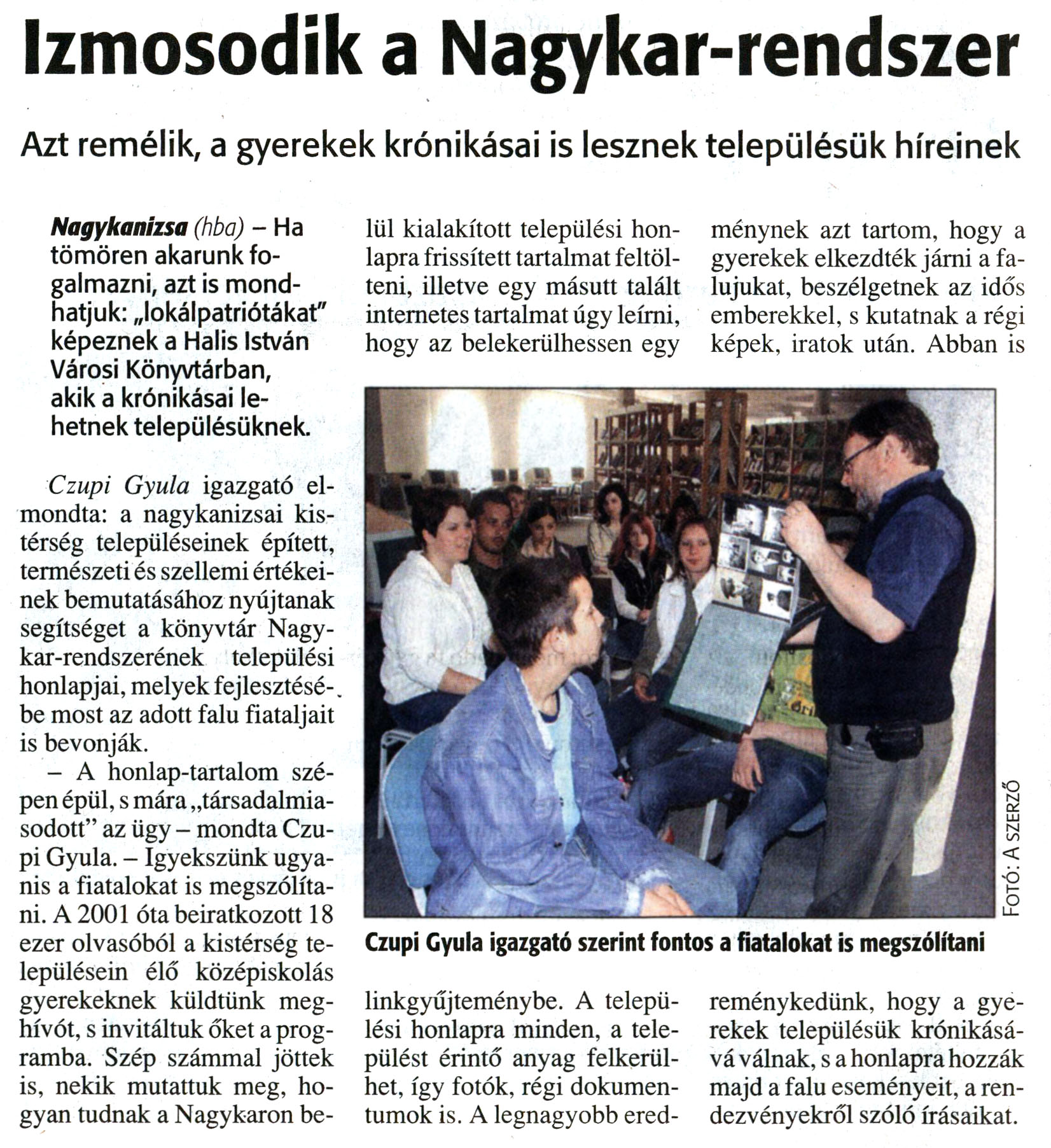 Nyilvános 14257 | 28452 | Zalai Hírlap 2008. június 9. 133. szám 12. oldal - Izmosodik a Nagykar-rendszer | A cikk szövege: Izmosodik a Nagykar-rendszer Azt remélik, a gyerekek krónikásai is lesznek településük híreinek Nagykanizsa (hba) - Ha tömören akarunk fogalmazni, azt is mondhatjuk: „lokálpatriótákat" képeznek a Halis István Városi Könyvtárban, akik a krónikásai lehetnek településüknek. Czupi Gyula igazgató elmondta: a nagykanizsai kistérség településeinek épített, természeti és szellemi értékeinek bemutatásához nyújtanak segítséget a könyvtár Nagykar-rendszerének települési honlapjai, melyek fejlesztésébe most az adott falu fiataljait is bevonják. - A honlap-tartalom szépen épül, s mára „társadalmiasodott" az ügy - mondta Czupi Gyula. - Igyekszünk ugyanis a fiatalokat is megszólítani. A 2001 óta beiratkozott 18 ezer olvasóból a kistérség településein élő középiskolás gyerekeknek küldtünk meghívót, s invitáltuk őket a programba. Szép számmal jöttek is, nekik mutattuk meg, hogyan tudnak a Nagykaron belül kialakított települési honlapra frissített tartalmat feltölteni, illetve egy másutt talált internetes tartalmat úgy leírni, hogy az belekerülhessen egy linkgyűjteménybe. A települési honlapra minden, a települést érintő anyag felkerülhet, így fotók, régi dokumentumok is. A legnagyobb eredménynek azt tartom, hogy a gyerekek elkezdték járni a falujukat, beszélgetnek az idős emberekkel, s kutatnak a régi képek, iratok után. Abban is reménykedünk, hogy a gyerekek településük krónikásává válnak, s a honlapra hozzák majd a falu eseményeit, a rendezvényekről szóló írásaikat. Képaláírás: Czupi Gyula igazgató szerint fontos a fiatalokat is megszólítani |